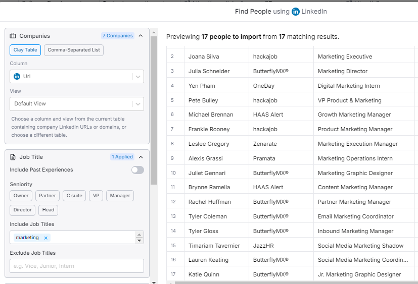 Also, it's not like a "fuzzy match" as it works in LI, where if you type in VP for example, our tool will only return matches for VP and not Vice President (currently), so adding both variations or more could help increase coverage a bit for now, unless the profiles are private as mentioned before. However, if you do see an increase in the number of people you can collect with other methods, that's also an option to then get those back into Clay to further enrich them if needed.