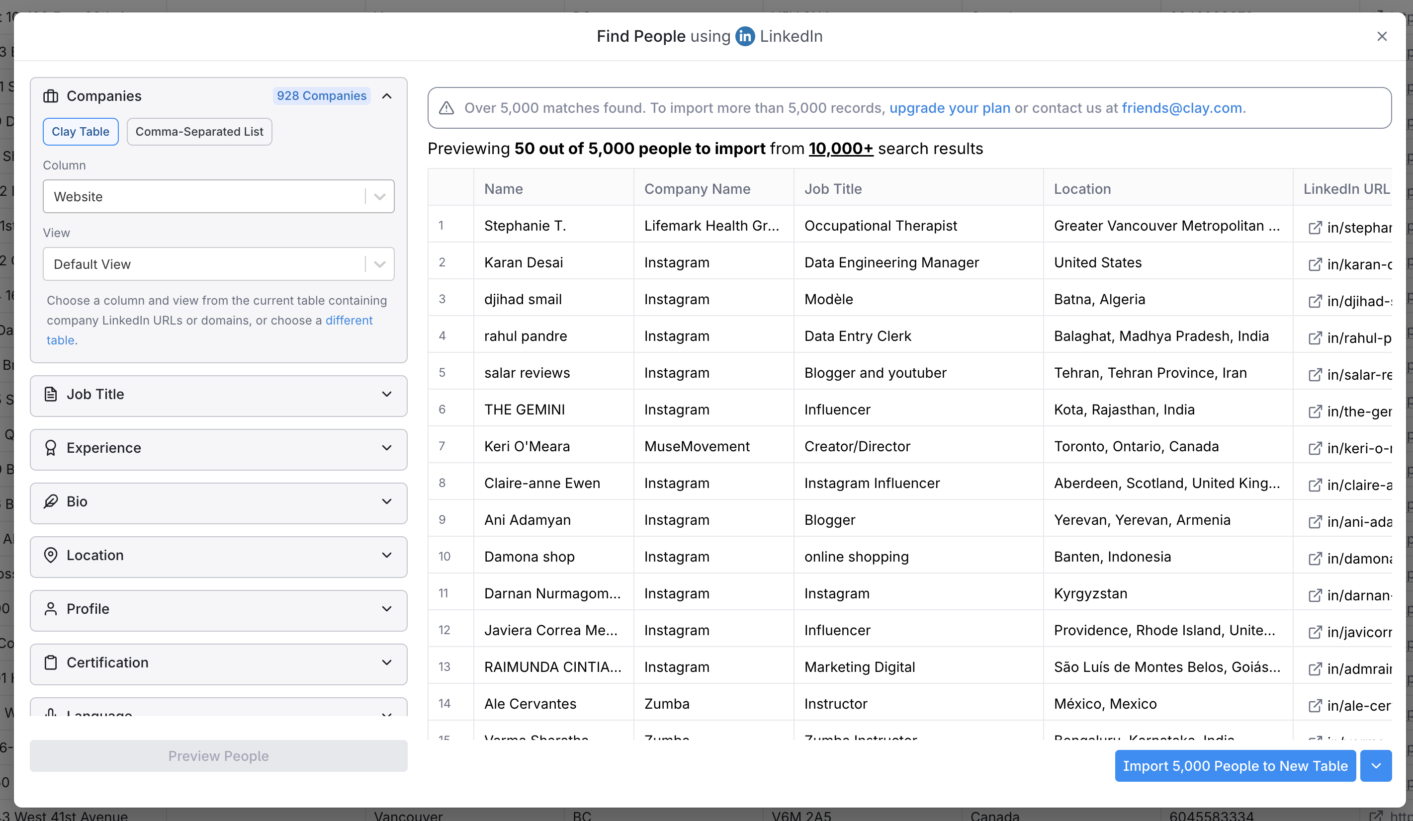 Ok I got that too now, but I’m still getting a very small number of records. Any other way to match on company besides LinkedIn? Again, these are SMBs that don’t often have LinkedIn companies. I also have phone numbers, addresses, and lat + long Also, I don’t understand what “Previewing 44 people from 57 out of 928 companies from 283 search results” means. Is it that there are 283 company matches, but only 57 people matches, and because of my limit on contacts/ company, I’m only seeing 44?