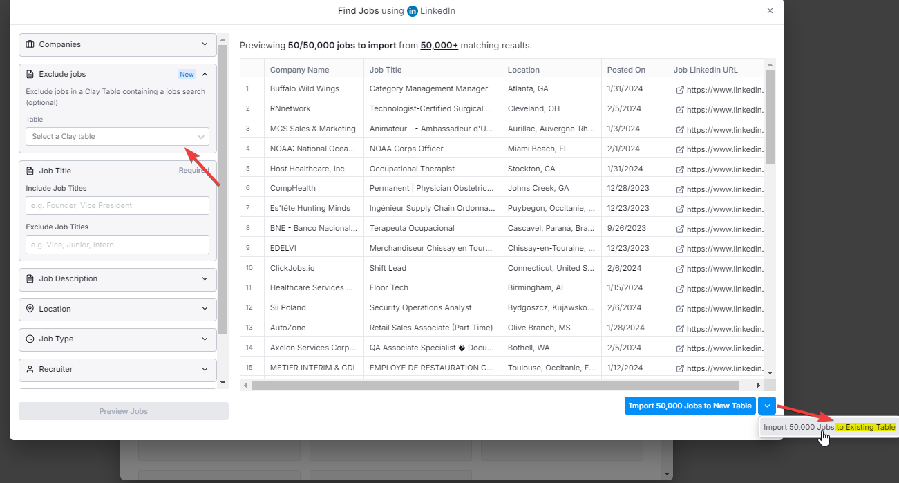 When you run a new find jobs search, it gives you some options but the default is to create a new table, instead, you would import to an existing one to consolidate the data. And the option to exclude previous jobs is also there, so you only get new records, but does require the corresponding plans (Explorer or above).