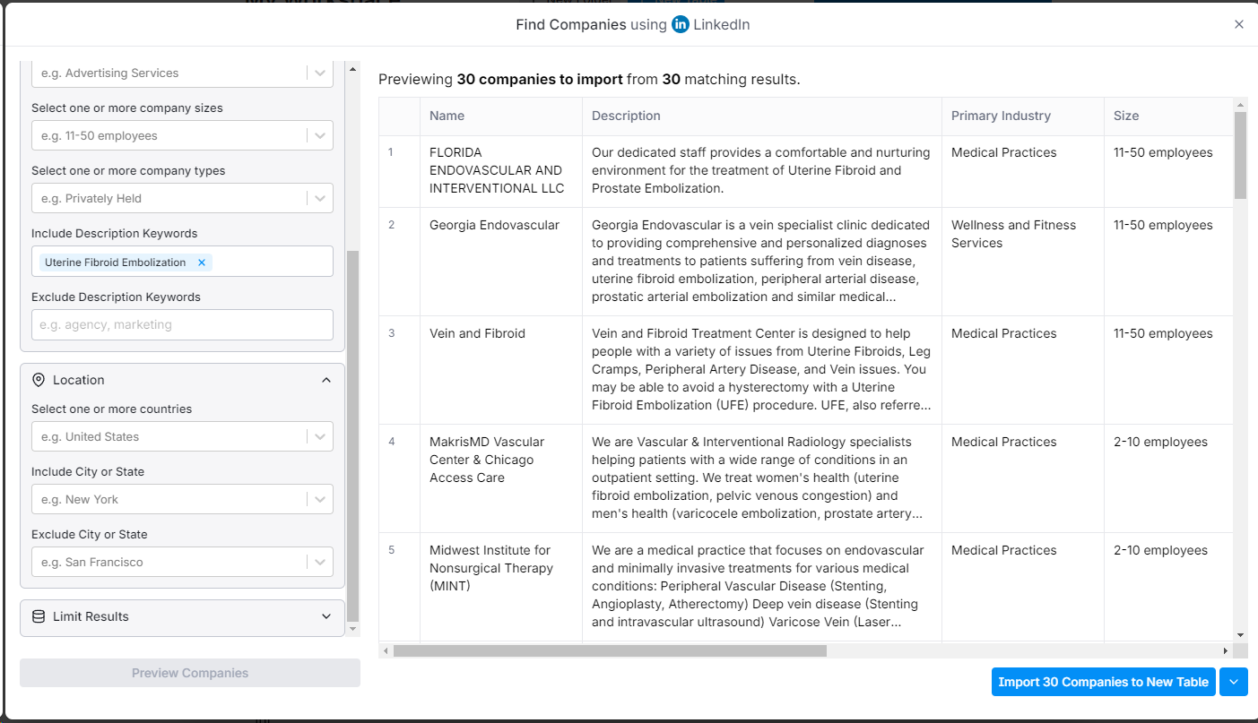 Hi team, request of the best way to use clay. I'm trying to find interventional radiology clinics not attached to hospitals within a city that perform specific procedures such as (Uterine Fibroid Embolization (UFE). I imagine there is a way to do this using google search operators or a google maps search and then scraping the website for the procedure names? Just not sure what tools I should use and what would be the most efficient way to get this done. Any help or guidance would be much appreciated. Then, need to find the leaders of those practices on LinkedIn and populate the email addresses that I can and reach out to the rest on LinkedIn. I have a subscription to apollo, so can start there with email and then use neverbounce. Imagine I can just find the linkedin org page and then enrich people with the titles I'm looking for, but not sure the most efficient path of credit usages to get emails if I have an apollo subscription already.
